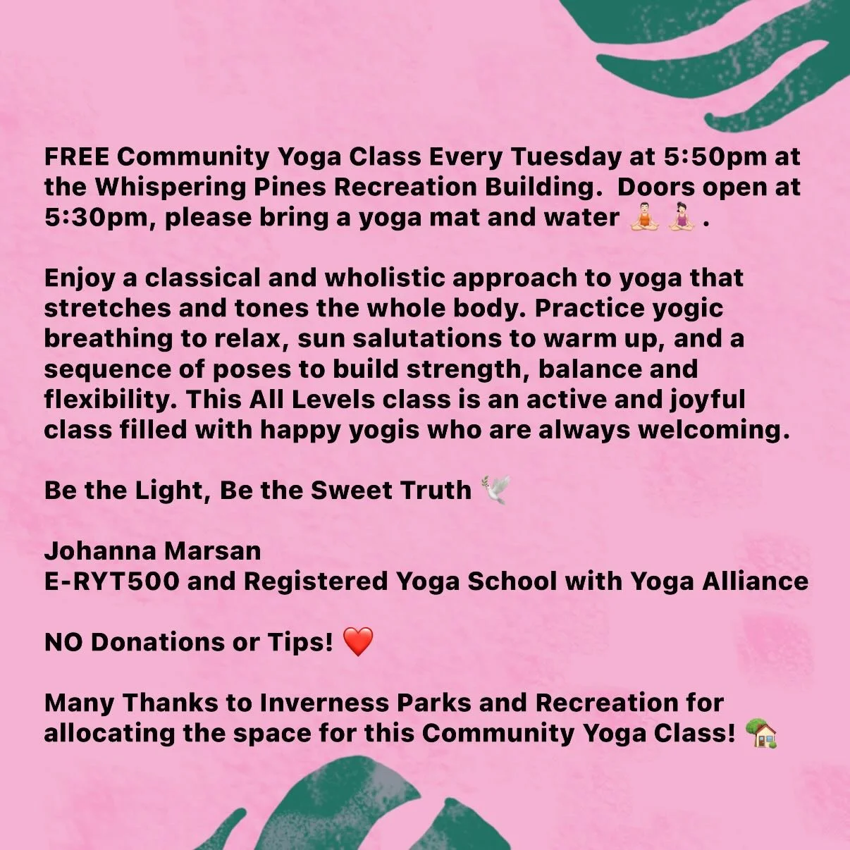 FREE Weekly Community Yoga Class, Tuesdays at Whispering Pines Park Recreation Building!